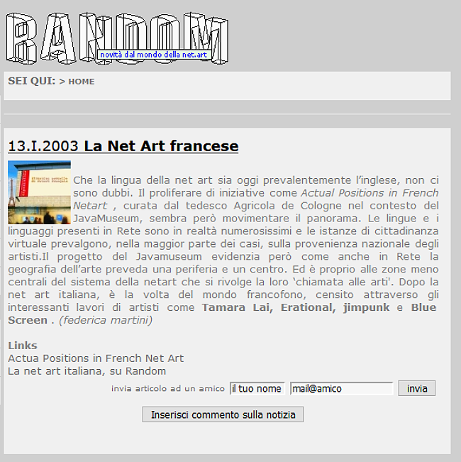 Galerie Satellite in Paris, Fnac stores, etc. But considering that “the twentieth century has freed the content of art, the twenty-first will have to free its display”, they mainly use the net as a new exhibition space. They have therefore created a “Center
