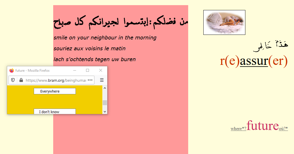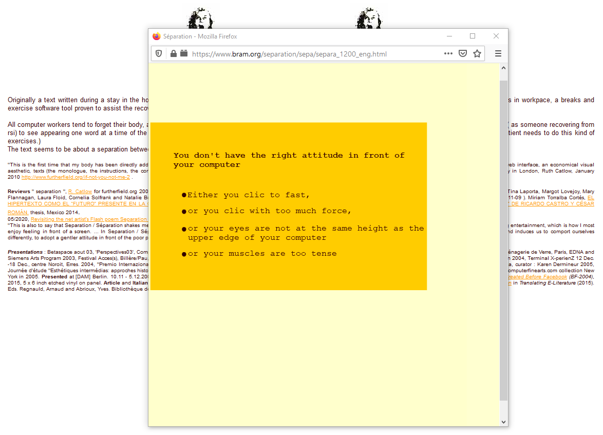 All computer workers tend to forget their body, and so risk to be a victim of Repetitive Strain Injury (RSI) one day. The visitors of ‘separation’ are constraint to click slowly ( as someone recovering from rsi) to see appearing one word at a time of the text. Every now and than a exercise is proposed and all interaction with the computer is postponed. (A recovering rsi patient needs to do this kind of exercises.)